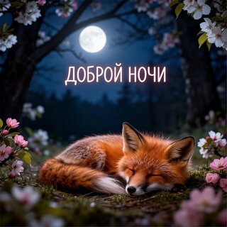 Красивая и уютная открытка с надписью «Доброй ночи» на фоне ночного леса. В центре композиции — милый спящий рыжий лисенок, уютно свернувшийся в клубок среди цветущих сакур под светом полной луны. Атмосферное изображение передает спокойствие, нежность и магию ночного сада. Идеально подходит для отправки в мессенджерах и соцсетях, чтобы пожелать приятных снов друзьям и близким.
