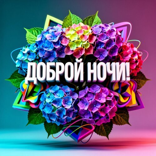 Красочное и яркое цифровое изображение с пышным букетом разноцветных гортензий — синих, розовых, фиолетовых и желтых. Цветы расположены в центре композиции на фоне стилизованных геометрических фигур и яркого градиентного освещения. Поверх букета нанесена крупная, объемная белая надпись на русском языке «ДОБРОЙ НОЧИ!». Изображение выполнено в высоком качестве, с насыщенными цветами и сочной детализацией, идеально подходит для использования в качестве поздравительной открытки в мессенджерах и социальных сетях.