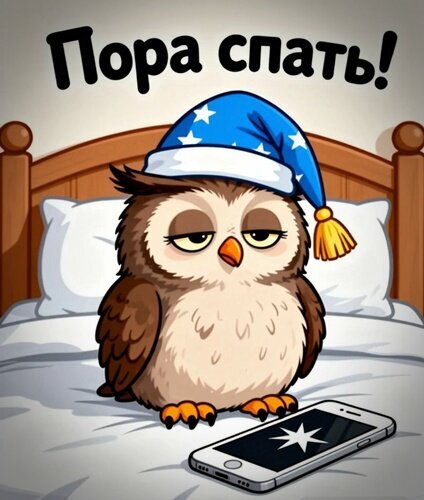 Забавная цифровая иллюстрация с мультяшной совой, которая выглядит очень уставшей и сонливой. Сова сидит на кровати в пижамном колпаке с белыми звездами, а рядом лежит смартфон. Надпись на русском языке «Пора спать!» подчеркивает тему отдыха, нарушения режима сна из-за гаджетов и необходимости вовремя ложиться в постель. Изображение выполнено в ярком мультяшном стиле, идеально подходит для контента о здоровом сне, цифровом детоксе и борьбе с бессонницей.