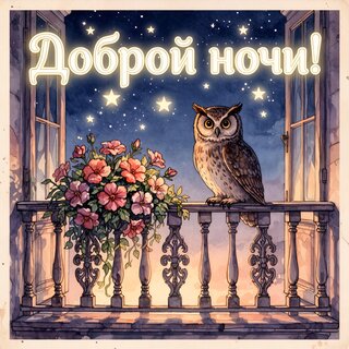 Атмосферная и уютная иллюстрация на тему «Доброй ночи!». На изображении запечатлен очаровательный лесной филин, сидящий на кованом балконе рядом с пышным букетом розовых цветов. Действие происходит в сказочную ночь под звездным небом, видимым сквозь открытые окна. Мягкое освещение, теплые тона и детализированны�� стиль создают ощущение спокойствия, магии и умиротворения. Идеально подходит для пожеланий спокойной ночи, открыток и создания вечернего настроения.