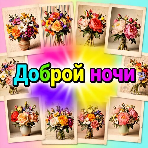 Коллаж из красивых открыток с яркими цветочными букетами в вазах и под фото-рамками. В центре расположена крупная надпись «Доброй ночи» с ярким неоновым градиентом и эффектом сияния. Композиция наполнена теплыми красками: розовыми, оранжевыми, желтыми и фиолетовыми оттенками, создавая уютное и праздничное настроение для пожелания спокойной ночи близким и друзьям.