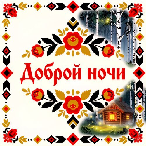 Красочное поздравительное изображение с надписью «Доброй ночи» на русском языке. Композиция выполнена в традиционном славянском стиле с использованием элементов хохломы или жостовского орнамента: яркие красные и желтые цветы на черном фоне. В правой части картинки расположены атмосферные вставки: ночной березовый лес и уютная деревянная избушка, освещенная теплым светом из окон. Декоративная рамка из геометрических ромбов завершает дизайн. Идеально подходит для отправки в мессенджерах и социальных сетях в качестве доброго пожелания спокойной ночи.