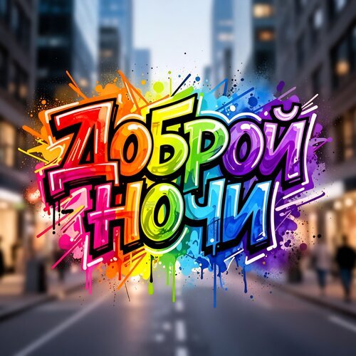 Яркая и красочная цифровая иллюстрация с надписью «ДОБРОЙ НОЧИ», выполненной в стиле динамичного граффити. Крупные, объемные буквы переливаются всеми цветами радуги — от огненно-красного и оранжевого до глубокого синего и фиолетового. Эффектные брызги краски и подтеки создают ощущение уличного искусства и драйва. Фон представляет собой размытый городской пейзаж с современными зданиями, что создает приятный контраст между четким, насыщенным текстом и мягким освещением мегаполиса. Идеально подходит для использования в качестве поздравительной открытки, сторис или эмоционального пожелания доброй ночи в соцсетях.