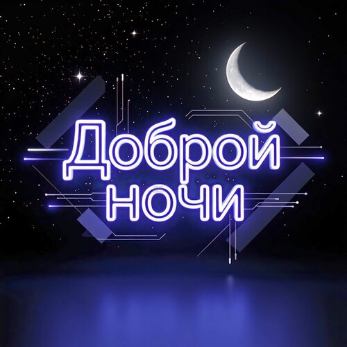 Красивая поздравительная открытка с надписью «Доброй ночи», выполненной в стиле неонового свечения синего цвета. Композиция на фоне глубокого ночного неба, усыпанного мерцающими звездами, с элегантным полумесяцем. Геометрические линии и футуристические элементы добавляют изображению современный стиль. Идеально подходит для отправки в мессенджерах и социальных сетях, чтобы пожелать спокойной ночи близким, друзьям или любимым.