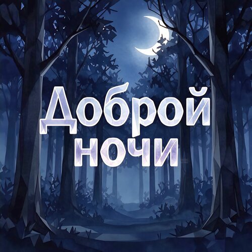 Атмосферная цифровая иллюстрация ночного леса под светящимся полумесяцем. На переднем плане расположена крупная надпись «Доброй ночи» белым стилизованным шрифтом. Изображение выполнено в глубоких синих и темно-фиолетовых тонах, создавая спокойное, сказочное и умиротворяющее настроение. Идеально подходит для использования в качестве открытки, пожелания спокойной ночи в социальных сетях или в качестве обоев для экрана. Стиль low-poly или векторная графика с мягким освещением от луны.