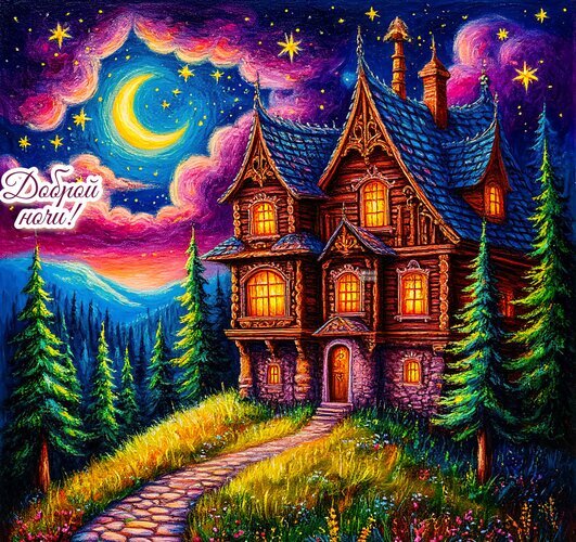 Сказочная ночная иллюстрация с уютным деревянным домом в стиле фэнтези. На картине изображен светящийся изнутри старинный особняк, окруженный хвойным лесом под ярким звездным небом с полумесяцем и волшебными облаками. Атмосферная цифровая живопись, передающая магическое спокойствие ночи, идеально подходит для пожеланий доброй ночи и создания сказочного настроения.