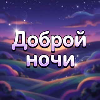Красивая поздравительная открытка с надписью «Доброй ночи» на фоне живописного ночного пейзажа. Изображение выполнено в мягких фиолетовых, розовых и синих тонах, передающих атмосферу спокойствия и умиротворения. На заднем плане видны холмы, звездное небо и мягкое сияние заката или рассвета. Идеально подходит для отправки в мессенджерах и социальных сетях в качестве милого пожелания спокойной ночи близким, друзьям или любимым.