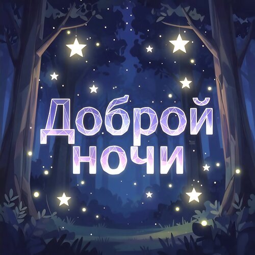 Красочная цифровая иллюстрация на тему «Доброй ночи». На фоне сказочного ночного леса с высокими деревьями и густой растительностью сияет звездное небо. По центру расположена крупная стилизованная надпись «Доброй ночи», выполненная в геометрическом полигональном стиле с мягким свечением. Вокруг текста и между ветвями деревьев парят яркие светящиеся звезды, создавая атмосферу волшебства, уюта и спокойствия. Идеально подходит для поздравительных открыток, статусов в соцсетях и пожеланий спокойного сна.