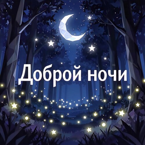 Атмосферная цифровая иллюстрация ночного леса в стиле low-poly. На фоне темного синего неба с полумесяцем и мерцающими звездами изображен густой лес. По земле и в воздухе разлетаются светящиеся огоньки, напоминающие светлячков или магическую пыльцу. В центре композиции расположена крупная белая надпись на русском языке «Доброй ночи», создающая уютное и спокойное настроение. Идеально подходит для использования в качестве поздравительной открытки, обоев для рабочего стола или стокового изображения для пожеланий спокойной ночи.