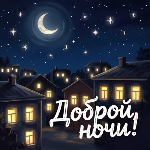 Уютная ночная иллюстрация с видом на спящий город под звездным небом и светлой луной. На переднем плане — дома с теплым светом в окнах, создающие атмосферу спокойствия и домашнего уюта. В центре кадра расположена красивая надпись на русском языке «Доброй ночи!». Идеально подходит для использования в качестве поздравительной открытки, сторис или статуса для пожелания спокойной ночи близким и друзьям. تتميز картинка мягкой цветовой гаммой и сказочным настроением.