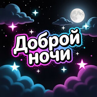 Красочная и уютная иллюстрация на тему «Доброй ночи». На фоне темного ночного неба с яркой полной луной и мерцающими звездами расположены пушистые облака в синих и фиолетовых тонах. В центре композиции расположена крупная, стилизованная надпись «Доброй ночи» белого цвета с черным контуром и неоновым розовым свечением. Изображение выполнено в современном мультяшном стиле, создающем атмосферу спокойствия, сказки и приятных сновидений. Идеально подходит для использования в качестве поздравительной открытки или тематического фона.