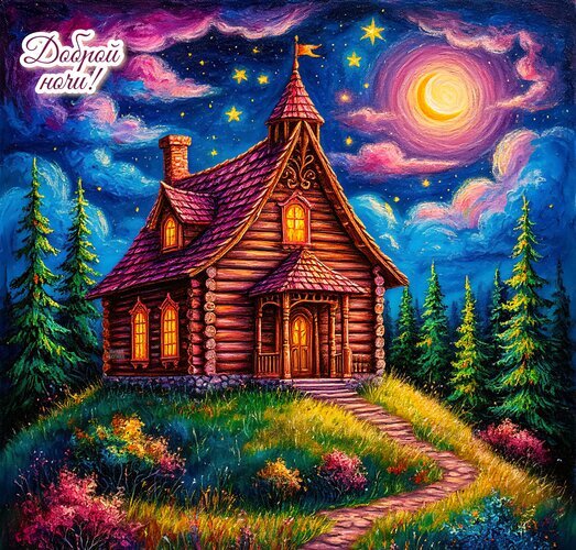 Сказочная иллюстрация уютного деревянного домика в лесу под сияющей полной луной. Картина выполнена в ярком, насыщенном стиле с использованием масляных мазков, создающих волшебную атмосферу сказки. На фоне ночного неба с яркими звездами и розовыми облаками изображен заснеженный или цветущий склон с тропинкой, ведущей к дому. Теплый свет из окон создает ощущение уюта и спокойствия. Идеально подходит для тематики «Доброй ночи», сказочных историй и вечернего релакса.
