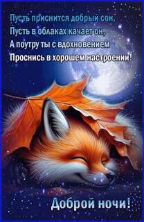 Доброй ночи! Пусть приснится добрый сон, пусть в облаках качает он, а по утру ты с вдохновением проснись в хорошем настроении!