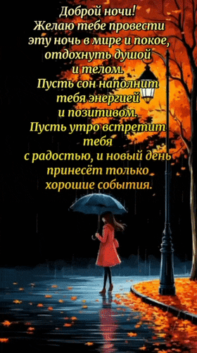 Доброй ночи! Желаю тебе провести эту ночь в мире и покое, отдохнуть душой и телом. Пусть сон наполнит тебя энергией и позитивом. Пусть утро встретит тебя с радостью и новый день принесет только хорошие события.