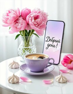 Теги:добрый день, день, цветы, пионы, пирожное, вкусняшка, красивая картинка, пожелания на каждый день, тюльпаны, кофе, сотовый телефон