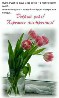 Пусть будет на душе у вас весна — в любое время года! А в вашем доме — каждый час царит прекрасная погoда! Добрый день. Хорошего настроения.