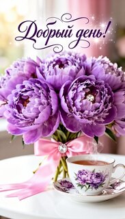 Красивая открытка с пышным букетом фиолетовых пионов и чашкой ароматного чая. На изображении нежный розовый бант с блестящей брошью и надпись «Добрый день!» изящным каллиграфическим шрифтом. Идеальное изображение для пожелания доброго дня, создания уютного настроения и отправки близким в мессенджерах или социальных сетях. Эстетичная композиция в пастельных тонах.