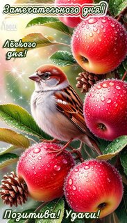 Красочная и жизнерадостная открытка с изображением маленького воробья, сидящего на ветке среди спелых красных яблок, покрытых капельками росы. На картинке расположены поздравительные надписи на русском языке: "Замечательного дня!", "Лёгкого дня!" и "Позитива! Удачи!". Изображение наполнено солнечным светом, яркими цветами и свежестью природы, идеально подходит для отправки друзьям и близким в мессенджерах для поднятия настроения.