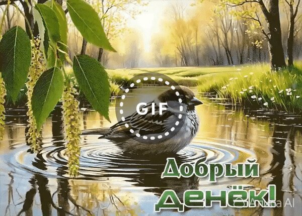 Красивая и уютная открытка с изображением маленькой птички (воробья), отдыхающей у кромки воды в залитом солнцем лесу. На переднем плане видны детализированные ветви с листьями и цветами, создающие эффект присутствия. Спокойная атмосфера природы, мягкий солнечный свет и круги на воде передают чувство умиротворения. На картинке присутствует надпись на русском языке «Добрый денёк!», что делает её идеальной для отправки дружеского приветствия или пожелания хорошего дня в мессенджерах и социальных сетях.