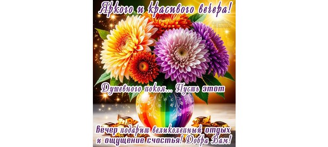 Яркого и красивого вечера! Душевного покоя... Пусть этот вечер подарит великолепный отдых и ощущение счастья! Добра Вам!
