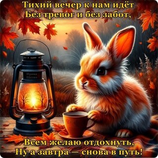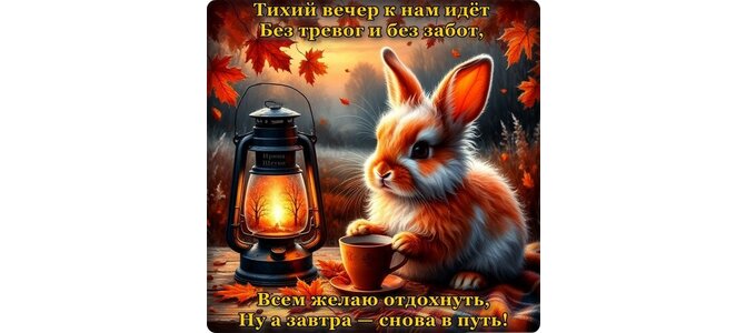 Тихий вечер к нам идёт без тревог и без забот, всем желаю отдохнуть, ну, а завтра — снова в путь!