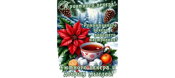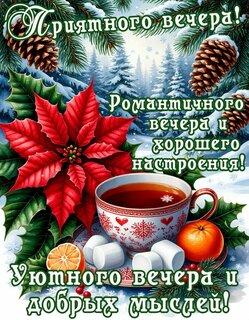 Приятного вечера! Романтичного вечера и хорошего настроения! Уютного вечера и добрых мыслей!