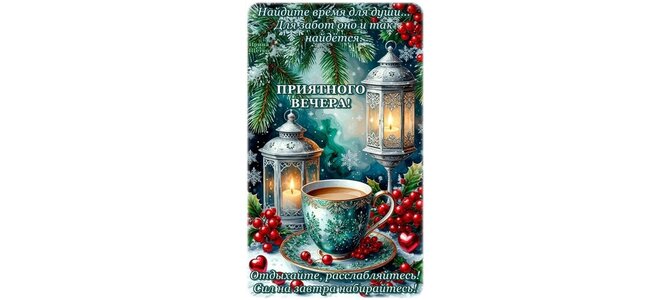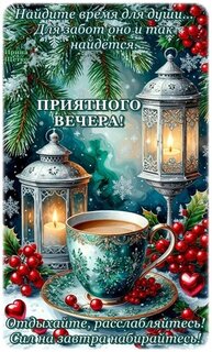 Найдите время для души... Для забот оно и так найдётся. Приятного вечера! Отдыхайте, расслабляйтесь! Сил на завтра набирайтесь!