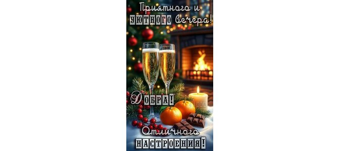 Теги:добрый вечер, вечер, апельсины, шампанское, новый год, свеча, бокалы, романтика, любовь, камин, красивая картинка, пожелания на каждый день, новогодние праздники
