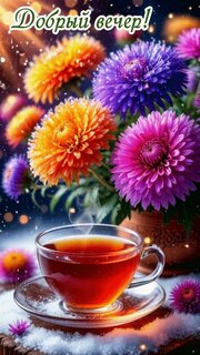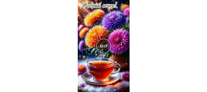 Теги:добрый вечер, вечер, гифанимация, чай, чашка чая, цветы, снег, зима, красивая картинка, тепла, добра, светлых мыслей, позитива