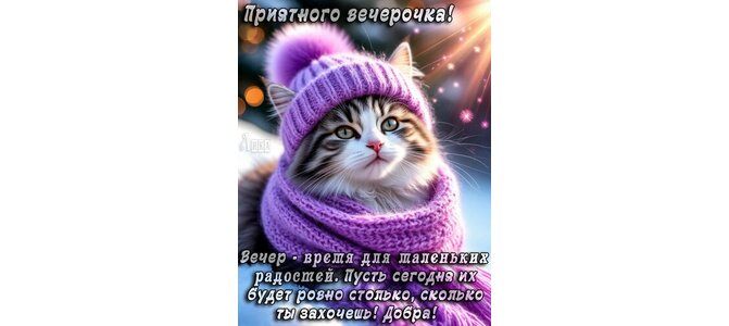 Теги:добрый вечер, вечер, кошка, котенок, зима, снег, шапка, лес, красивая картинка, пушистик, пожелания на каждый день, добра, радости