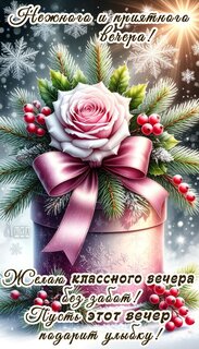 Нежного и приятного вечера! Желаю классного вечера без забот! Пусть этот вечер подарит улыбку!
