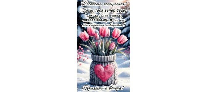 Весеннего настроения! Пусть твой вечер будет как любимый сериал: захватывающим, но без неожиданных поворотов! Приятного вечера!