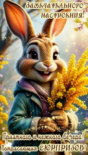 Теги:добрый вечер, вечер, зайка, букет цветов, мимоза, весна, красивая картинка, пожелания на каждый день, нежного и приятного вечера, сюрпризов