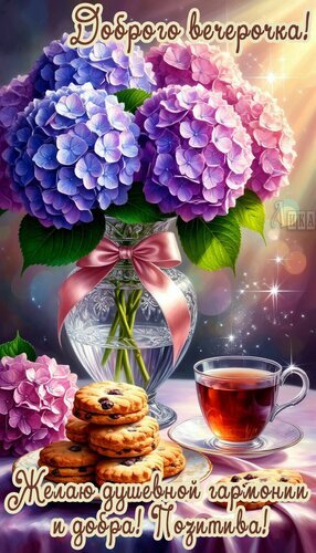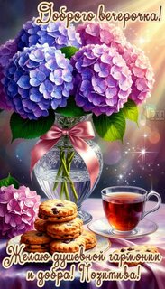 Теги:добрый вечер, вечер, цветы, чай, печенье, вкусняшки, гортензия, пожелания на каждый день, красивая картинка, душевной гармонии, позитива, добра