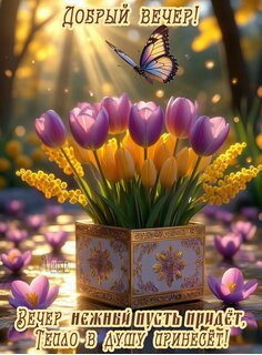 Теги:добрый вечер, вечер, позитив, цветы, пожелания на каждый день, красивая картинка, мимоза, тюльпаны, нежного вечера, душевного тепла