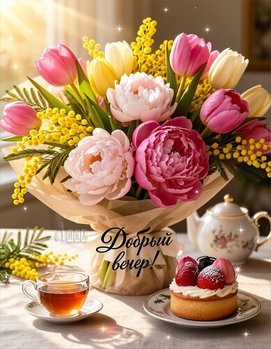Теги:добрый вечер, вечер, цветы, пирожное, красивая картинка, букет цветов, чай, мимоза, пожелания на каждый день