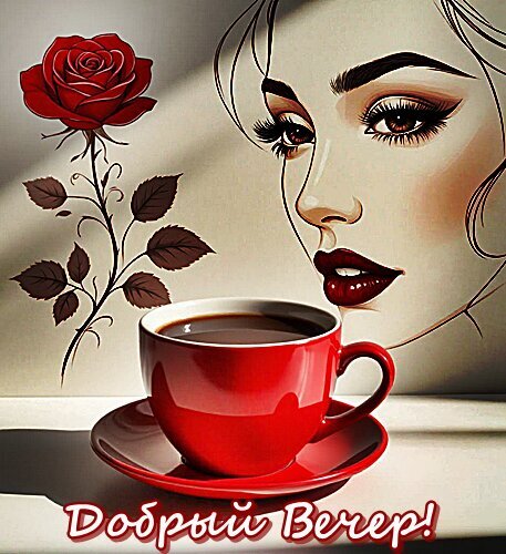 Эстетичное и романтичное изображение, идеально подходящее для пожелания доброго вечера. На картинке представлен крупный план чашки горячего кофе или чая в ярко-красной керамической кружке с блюдцем. На заднем плане — стилизованный художественный рисунок женского лица с выразительными глазами и губами, а также изящная красная роза на длинном стебле с темными листьями. Композиция выполнена в теплых тонах с мягким освещением, создавая атмосферу уюта, нежности и элегантности. Текст на русском языке «Добрый Вечер!» в нижней части кадра добавляет завершенности и делает изображение идеальным для поздравлений в социальных сетях.