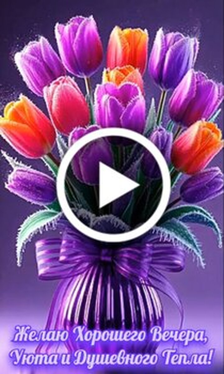 Красивое видео с пожеланием хорошего вечера, уюта и душевного тепла. В центре кадра расположен великолепный букет ярких фиолетовых и оранжевых тюльпанов в изящной вазе, украшенной пышным бантом. Видео наполнено атмосферой спокойствия и нежности, идеально подходящей для того, чтобы отправить близким, друзьям или коллегам в качестве приятного эмоционального приветствия в конце дня. Это эстетичное визуальное поздравление поможет создать теплое настроение и подарить улыбку каждому получателю.