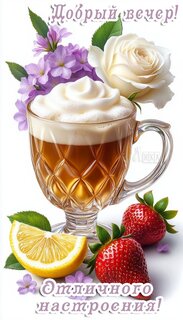 Теги:добрый вечер, вечер, красивая картинка, отличного настроения, лимон, клубника, фрукты, цветы, кофе, пожелания на каждый день