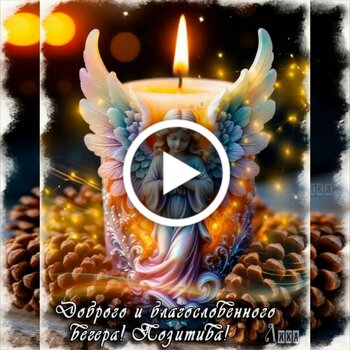 Красивое и вдохновляющее видео с изображением светящейся свечи, украшенной фигурой ангела с распростертыми крыльями. Свеча стоит на фоне натуральных сосновых шишек, создавая атмосферу уюта, покоя и духовного тепла. На видео наложен текст с пожеланием доброго и благословенного вечера. Визуальные эффекты включают мягкое мерцание огня, золотистые искры и легкую анимацию, что делает ролик идеальным для отправки близким в качестве теплого вечернего приветствия. Это видео наполнено светом и спокойствием, помогая настроиться на мирный лад перед завершением дня.