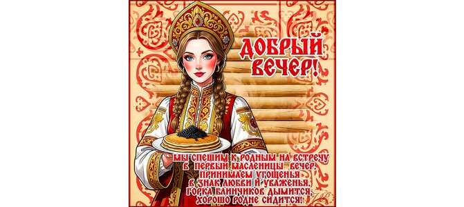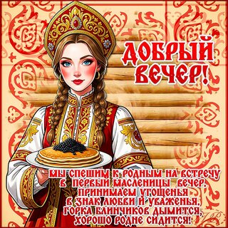 Открытка "Добрый вечер. масленица встреча Мы спешим к родным на встречу в первый масленицы вечер"