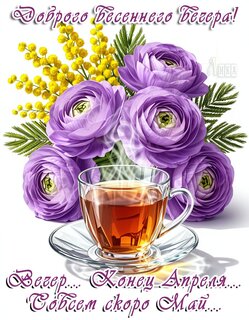 Теги:добрый вечер вечер, чай, цветы, розы, апрель, времена года, пионы, пожелания на каждый день, конец апреля