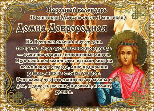 Народный календарь. 16 сентября (Дата по ст. ст. 3 сентября) Домна Доброродная. На Руси был обычай в этот день собирать вокруг дома всякую рухлядь - особенно старые изношенные лапти. Их в большом количестве вешали либо на кольях вокруг огорода, либо под крыши хлебов, либо на столбы у ворот. Считалось, что это защитит от сглаза и дом, и двор, и скотину, и урожай, и самих хозяев.