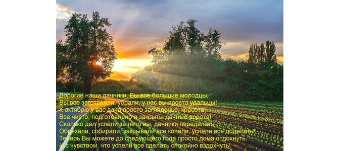 Теги:дорогие наши дачники, вы все большие молодцы, вы все заготовили, убрали, у нас вы просто удальцы к октябрю у вас дача просто загляденье, красота, все чисто, подготовлено и закрыты дачные ворота сколько дел успели за лето вы, дачники переделать, обрезали, собирали, закрывали все копали, успели все доделать теперь вы можете до следующего года просто дома отдохнуть