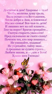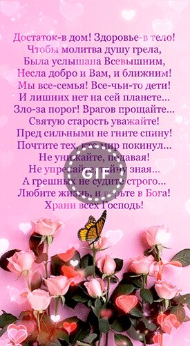 Достаток - в дом, здоровье - в тело, Чтобы молитва душу грела, Была услышана Всевышним, Несла добро и Вам, и ближним. Мы все - семья, все - чьи-то дети. И лишних нет на сей планете... Зло - за порог. Врагов прощайте... Святую старость уважайте! Пред сильными не гните спину! Почтите тех, кто мир покинул... Не унижайте, подавая! Не упрекайте, тайну зная... А грешных не судите строго... Любите жизнь, и верьте в Бога! Храни всех Господь!