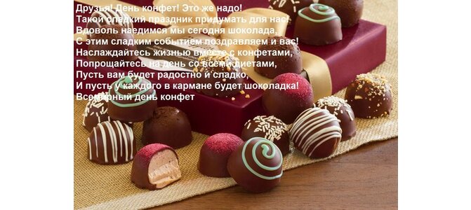 Теги:друзья день конфет это же надо такой сладкий праздник придумать для нас вдоволь наедимся мы сегодня шоколада, с этим сладким событием поздравляем и вас наслаждайтесь жизнью вместе с конфетами, попрощайтесь на день со всеми диетами, пусть вам будет радостно и сладко, и пусть у каждого в кармане будет шоколадка всемирный день конфет