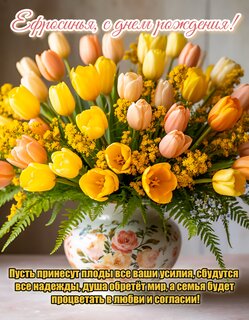 Красивая поздравительная открытка с пышным букетом желтых и персиковых тюльпанов в декоративной вазе. На изображении расположена именная надпись на русском языке: «Ефросинья, с днем рождения!» и трогательное пожелание процветания, мира в душе и семейного счастья. Идеально подходит для отправки в мессенджерах и социальных сетях в качестве личного поздравления с днем рождения для женщины по имени Ефросинья.