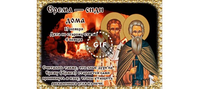 Ерема- сиди дома.17 ноября. Дата по старому стилю: 4 ноября. Считалось также, что злые духи на Ерему (Еремея) стараются сами проникнуть в избу, чтобы утащить раскаленного угля из из печи.