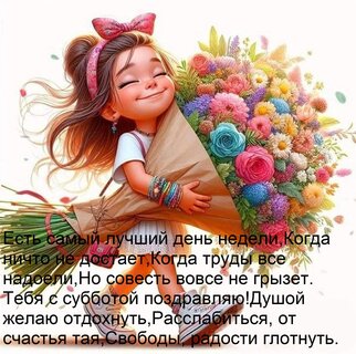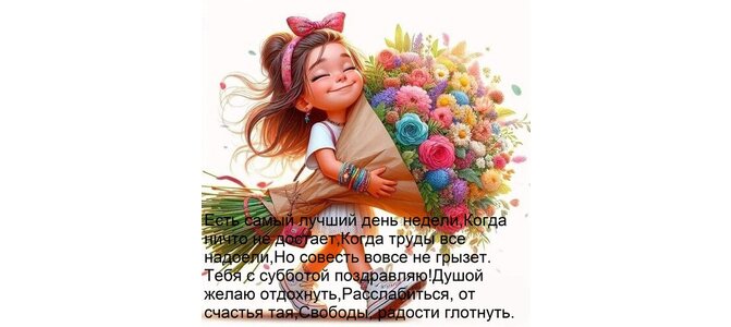 Теги:есть самый лучший день недели, когда ничто не достает, когда труды все надоели, совесть, вовсе, грызет, тебя, субботой, поздравляю, душой, желаю, отдохнуть, расслабиться