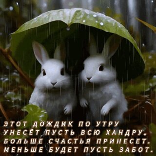Милая и трогательная картинка с двумя белыми кроликами, которые прячутся под большим зеленым листом во время дождя. Изображение наполнено атмосферой уюта и спокойствия. На картинке присутствует вдохновляющая надпись на русском языке о том, что утренний дождь смоет всю хандру и принесет больше счастья и меньше забот. Идеально подходит для использования в качестве позитивной открытки, статуса в соцсетях или обоев для телефона, чтобы поднять настроение в пасмурный день.